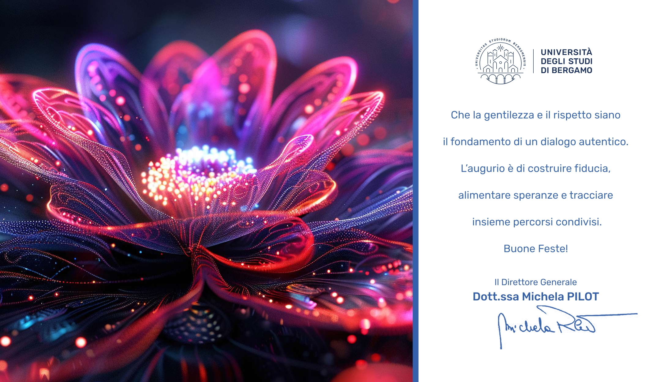 Sono previsti gli interventi del Rettore dell'Università degli studi di Bergamo, Prof. Sergio Cavalieri, del Direttore Generale, Dott.ssa Michela Pilot, e del Presidente della Consulta delle Studentesse e degli Studenti, Gianluca Messina.